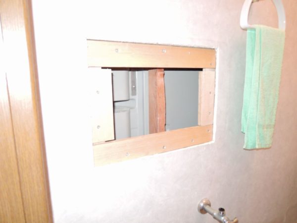手洗い器本体を取外して、新しく取付ける手洗い器を固定するために補強をします。